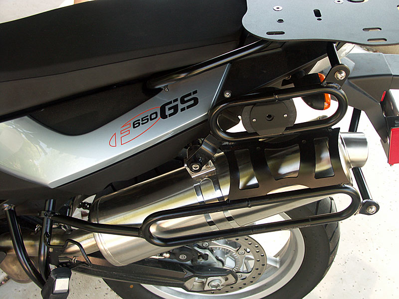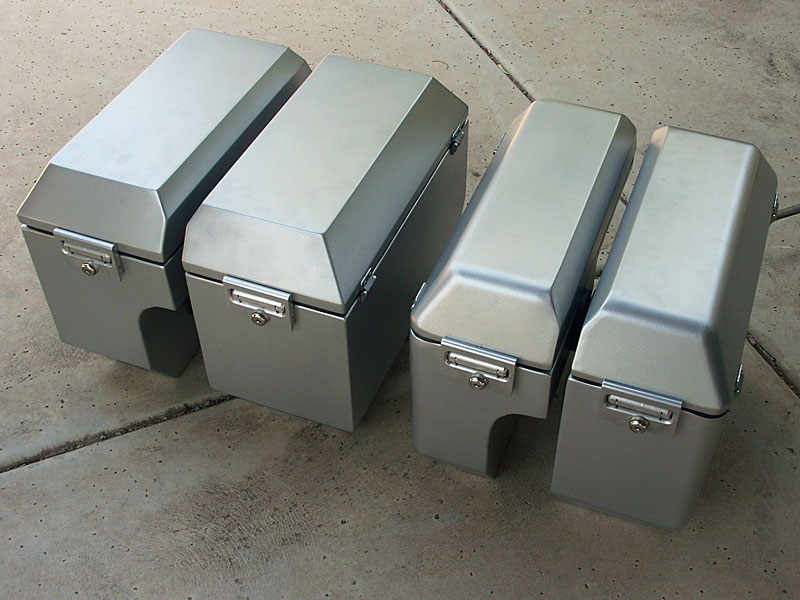 8" Safari - 8" x 20" x 17.5" holds 68 liters combined with a total width of 33" (840mm) on the bike. Thats 230mm narrower than BMW Aluminium panniers 10" Odyssey II - 10" x 20" x 17.5" holds 90 liters combined with a total width of 37" (940mm) on the bike. Thats 130mm narrower than BMW Aluminium panniers The Odyssey II boxes are the largest we make for the new F650/800 GS. Of course they are powder coated inside and out with a choice of silver, charcoal or black. |