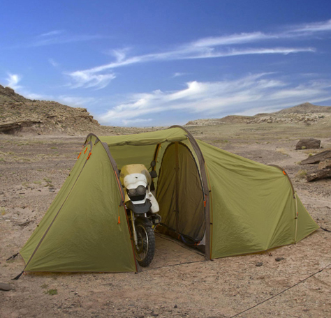 • Frame design creates nearly vertical inner tent walls; the result is spacious, area-wide headroom, enough to stand fully inside tent • Adventure motorcycle bay is designed to accommodate a full size adventure tourer with panniers • Hooped pole configuration stands up under high winds and creates an impressively roomy interior • Flow-through venting circulates air from one end of the tent to the other, ideal in hot climates • Rectangular floor plan optimizes usable space and allows comfortable sleeping, space for a queen size air bed • Quick, convenient and sheltered access through two doors and two large vestibules • Hybrid floor combines fully, factory sealed seams and bathtub curves to create a tough waterproof finish • Large vestibules improves livability • Mood-elevating color creates a pleasant interior even when the weather outside is uninviting
