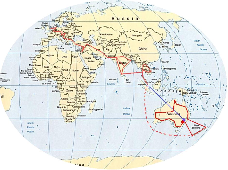 This page will lead you to details of where we traveled. Click on the link (red dots) from the map below to see where we have been, pictures taken and diary type extracts about the places. The red dots on the map should lead you to the pages for the continents that we traveled in.- so click on a dot ! Australia | |||||||