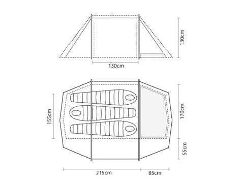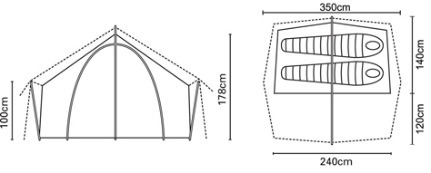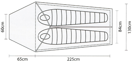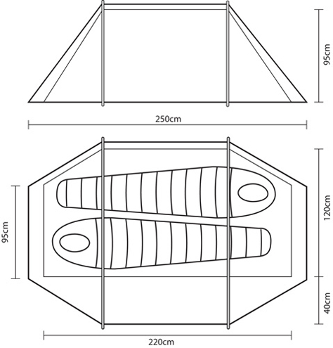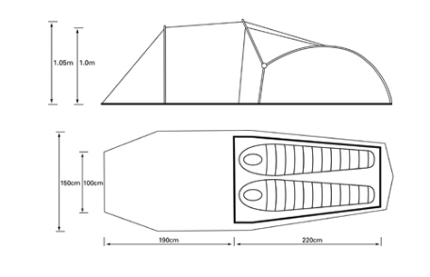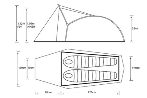 Weighing just over 3kg the amount of space available inside is remarkable, and the 1.76m of headroom makes it possible to change out of wet clothing in the porch whilst keeping the inner tent clean and dry. The porch is 3m2 and will accomodate folding chairs and rucksacks with ample space left for cooking or accessing the inner tent. A smaller "back door" makes it possible to exit the tent in the night without crossing your partner, or can be used as a main entrance if the porch is required for storage of large items such as bikes. The use of our superlite fabrics on this model means that the flysheet seams can't be taped, but are instead covered by a pole hood (included). A major benefit of these superlite fabrics (other than the incredible low weight, obviously!) is that this huge 2 person tent has a packed size of a mere 55x20 cms.