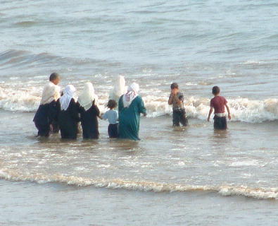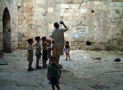 On we went to Tartus - another sea side town but which looked smaller on the map. We found sea front accomodation for $12 per night - not too bad considering we were expecting around $20. There was no swimming to be done here - we decided against it when we noticed that the locals all swam only in full clothing - including the women in the full outfits with scarf - very odd. At 6 p.m. each evening the police blocked the road outside the hotel and a huge market started at the end of it with loads of food stalls along the main sea front. This provided serious amusement on our first night - watching the problems the two police-bikers had trying to keep people from driving down the road. We wandered around the old city the next day - mish mash houses slapped together on top of the old city ruins. A group of kids decided to follow Cliff around whilst he was videoing watching the LCD screen with awe. |