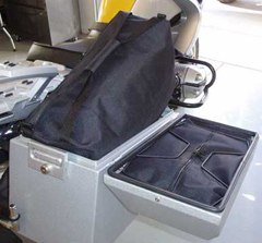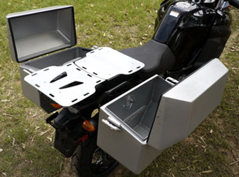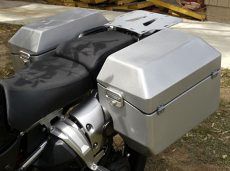 The Odyssey II system pictured below shows the Odyssey II panniers with the Safari top box fitted, the Odyssey top box does not have the hook eyes on the corners of the lid (see more photos on the Top Boxes and rear compartment page) note that the panniers are fitted in the fore and aft positions.
