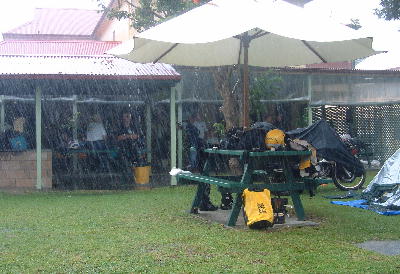 It rained and rained and rained. We took the route via the "Sunshine Coast" - yeah right - it must have seen us coming cos it hid. Reaching Ulmarra we found the hotel that had allowed us to camp in the back garden. There were around 30 people there before us - this would be fun. We rode in and were immediatley inundated with questions, where were we from, where were we going, where had we been..............all started to seem amazingly familiar..........but this is civilisation as we know it - not Pakistan, Iran etc. On arrival it was still raining (actually chucking it down is more appropriate), so we hung out for a while and waited for that - "Right get the tent up quick" moment. |