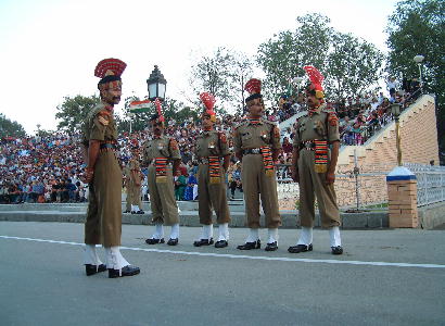 From Amritsar we returned to the border to watch the flag lowering ceremony, for this we hired an auto rikshaw for the 30 km drive and shared it with Maarten and two Aussie ladies ( Jan and Robin ) that we met at Mrs Bandahari's. The flag lowering ceremony was very funny to watch from a Western perspective, and acually a little worrying as they take this very seriously. The ceremony involves a lot of marching as fast as possible followed by stamping the ground as hard as possible and then inflating their chests as much as possible and using a few arm movements to try to suggest to the opposing side that they are inferior, add to this the slaming shut of the gates and what you have here is the best comedy entertainment since Monty Python, now add into the mix crowds of Indians and Pakistani's in their respective grandstands cheering and shouting as loud as possible, all taunting each other, and a couple of people on each side are allowed to run upto the gates and wave their respective flags at each other before then running back in front of the crowds to a temultuious cheer. Because we were foriegn tourists we were given special treatment and taken to the VIP section, then as the ceremony was about to the senior officer invited us to move to an even better position, from which Cliff was able to capture most of the ceremony on video. This was one of those evenings that will stay with us for many years to come. | ||||||||||||||||