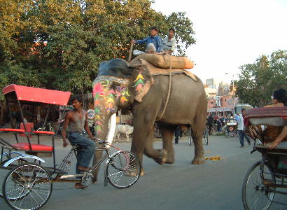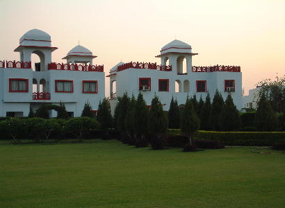 We left the following morning after Cliff threatening to murder a couple of lads that insisted on sitting on the bikes, despite the fact that they were not on a good surface. In his rage he tripped and knocked my bike off it's stand ! The road became dual carriageway - hooray - this will stop the nutters from coming at us head on - NO. There were all sorts heading in the fast last the wrong way - including a camel and cart ! There was some respite though from the constant onslaught on this road. We had decided to avoid Delhi altogether, another large polluted city - however, we still had to get round it and this took a couple of hours of fighting with scooters, cycle and auto-rickshaws for space. Eventually we found our selves on the right road for Jaipur, though this feat was achieved by pure luck, as we made our way around Dehli we saw only one sign for Agra and no signs for Jaipur at all, we were pretty lost when we stopped for a smoke and attempted to work out where we were, we showed our map to an auto rickshaw driver which confused him a little but after explaining that we wanted to go to Jaipur he said turn left at the next set of lights and you are on the road to Jaipur, so for once we were lost and several miles from where we thought we were, but somehow we had managed to take the purfect route, god its nice when a cock-up goes your way !!!. We stopped at a roadside hotel between Dehli and Jaipur which was like another world. The lawn was immaculately cut and flat, we were treated like kings by the staff and the peace was wonderful. |