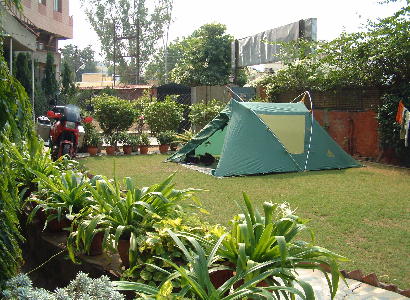 We only had 180km to do to get to Jaipur so we left the hotel at noon after lazing around for breakfast. The road continued to be good until the last 5km when everything was back to normal. Eventually we found the Jaipur Inn Hotel that apparently allowed camping on the lawn - it did so after looking at the rooms that were available and deciding that they were little more than a shack type construction we set up the tent. | |||||||||||||||