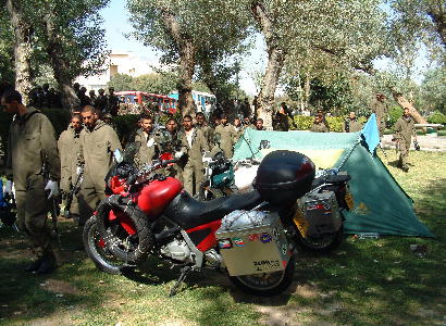 We left Tehran and headed for Esfahan. The motorway was signed "no motorcycles" but we managed to get through by acting the dumb tourist. We had been given a contact name in Esfahan for cheap accommodation but on arriving the pay phones would not ring a mobile number. Two students took us by taxi to the Communications Office to make the call, although this did not help as his mobile was switched off. This left us with no accommodation at all and meant the search was to begin. The two lads offered to help us and enquired with several hotels as to availability and price. However, this weekend was a holiday for the Iranians ( Father's Day ) and all hotels were either fully booked or only had expensive rooms left. It was obvious that the lads needed to be elsewhere so at the last hotel they tried we said that we would find something ourselves, they spoke with the doorman of the hotel and he telephoned a friend that spoke good English so that we would have a translator. Ten minutes later his friend arrived by car. We explained our situation and he said that he and his friends had in fact spent last night on the floor of the hotel gym as there were no rooms available. We had been told that there was camping in Esfahan so asked about this. No, he said , no campsites. Then he asked did we have a tent with us if so we should just camp in the park with the locals ! Apparently this is quite normal in Iran. He gave us a lift back to the bikes and we rode to the park where we found several Iranians camped out. Not all had tents, some merely slept on a carpet ( explains why they need so many carpets ! ) under the sky, many of them also parked their cars on the road beside the park and then slept on the pavement. | ||||||||||||||
