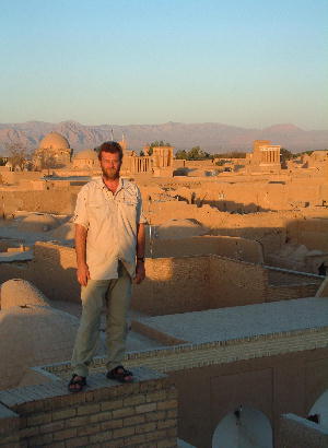 We all left the next morning for Yazd. Yazd is famous in Iran for it's old city which consists of single storey houses clad in a mud/straw plaster. We had not originally planned ot go hear but Andreas wanted to and we had decided that it would be a good idea to meet up with a few other people crossing the Pakistan border. We have been warned that this is a drugs running area and that safety in numbers counts. It was about now that our patience came into play and still is being tested. We arranged to leave at around 10 a.m., however, it was 1 p.m. by the time Andreas was ready. We have since learnt that he is the worst time-keeper going. However, we will stick it out until we enter Pakistan. We arrived in Yazd in the early, but dark, evening. A local man found took us to a guest house and we checked, ate and crashed out. We went to Y@zd internet cafe and then went to the abandoned mosque to see the sunset from the roof. We missed it ! Two local women came up to the roof and started asking Jenny many questions, offering tea at their grandmothers house which we accepted. We now accept many invitiations as it is the only way that you get to see the real Iranian people and lifestyle. We went into the main room of the house which had only three walls and an opening onto the courtyard which was the middle of the house. Here there were around 10 people - uncles, aunts, grandchildren and friends. The women were very friendly and talkative but the men seemed a little strange. One was definately a few cans short of a six pack and the grandfather very strange. We collected some cans of vodka and more alcohol on the way back to the hotel, we ate crisps and dry bread for dinner. The next night we agree that we are going to go to a teahouse that had been recommended for traditional food - this did not work out - we left Andreas at the internet cafe and agreed to meet at 8 p.m. At 8.30 he phones - still in the internet cafe but leaving immediatley - 9.15 he gets back. The restuarant is shut so we eat naff kebabs again. This is how it goes on. | |||||||||||||||