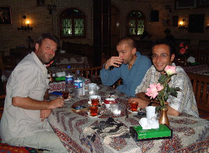 That evening we met Andreas sitting in the lounge with two Iranian men who turned out to be Ramin ( an English School-teacher ) and Amin-Ali ( an intelligence officer ). We joined them for dinner at a restuarant that Andreas had found earlier in the week and had the best kebabs that we have come across so far. Ramin was keen to improve his English conversation but despite our efforts every sentence was pronounced as though he had read it straight from a literature book and every word was explained in great detail, this meant that he became impossible to listen to and concentrate on. We had many discussions on the use of the English language. literature and poetry. It was noticeable that they had both learnt most of their English from reading Classical Literature and it was also reflected in their understanding of English life. They think that England is the same as they have read in Charles Dickens and that there is a major class structure still - which although we explained was not like this anymore we feel that they are not convinced !