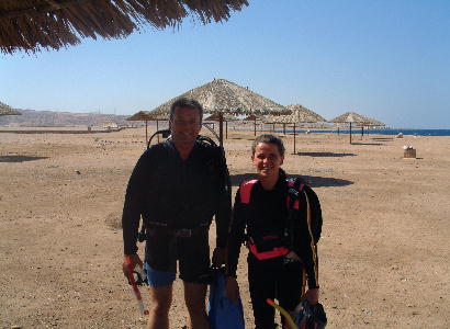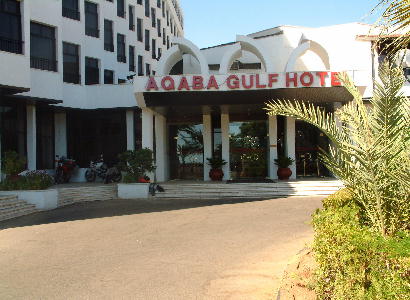 From Petra we went down south almost the the Saudi Arabian border to Aqaba - Jordan's only coastline, along the Red Sea. They swapped 6000 square km of desert for 17km of coastline with Saudi Arabia in the 1950's. Aqaba is the diving centre for Jordan and ours for the next few days. We tried a couple of hotels that had their own diving clubs asking prices and finally decided to treat ourselves with a 4 star hotel after they advised us that the diving would be free - we just needed to rent equipment. They were also kind enough to give us priveldged parking for the bikes ( see picture below ). Off we went to The Royal Diving Club in the morning only to find out that the person we spoke to at the hotel obviously did not understand what we were asking him as the diving was not free at all. We decided to do one dive that afternoon as we were there. The corals and fish were beautiful and we saw a turtle ( although he was not impressed by being made to move so that we could see him more clearly ). On return to the hotel Cliff complained bitterly with the reception but to little avail - we were offered free dinner in lieu of any reduction in the room price. So we ate well that night, although it was wasted on us as we really were not that hungry. We went to see the Red Sea Dive Centre to book for diving the next day with them - this time for two dives. Our first dive was magnificient and so much better than the Royal Diving Club. There were less people and Ahmed really knew his stuff and where to find the interesting fish. We played with Clown Fish that came out to see if we needed cleaning as we passed but the highlight was holding a Puffa Fish. This is a strange creature - when frightened it puffs itself up to around football size and shape - it has quite large pretty eyes and a small round mouth. To touch it was hard with small spikes around its skin - Cliff found this out the hard way - trying to hold it in the palm of his hands rather than with his finger-tips which caused him to drop it. On our second dive we swam around an old army tank that had been sunk a couple of years ago on purpose to create more places for the coral to grow and add interest to diving expeditions. We left the following morning although rather late as both Cliff and I have been having stomach cramps for a week or so now - on and off - but that morning we felt worse so asked to be woken up at 11.30 - half an hour before checkout time. We made it to Wadi Rum which was only 50 km away with no problems. | ||||||||||||||||
