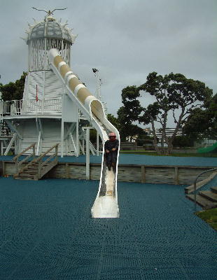 We got onto the ferry as planned only to find that it had recently been bought from a French company so all the signs were in French (at last it the lessons come in handy). The boat was used previously for longer journeys and so had no seating lounges, only cabins with no doors (free to use) and a very very small bar area - with no beer or alcohol sales. Food consisted of the daily special and nothing else - although it was good. We arrived at Wellington at 9.30 pm and headed straight to Rick & Lyndsey's, who we met at the start of our journey in Luxembourg. If you don't mean it don't offer a room to motorbikers - cos they WILL turn up :-) It was still raining the next morning so we decided to wander into Wellington for a quick look around. Although it is a very clean and pretty city it is yet another NZ city so not many pictures I'm afraid. We did find an excellant slide in the childrens area near the waterfront. As it was raining we where the only people around so decided to give it a go - Jenny went first and came hurtling down (as the slide was wet and we were in nylon waterproofs), skidding 20 foot further than the end of the slide - manic. Cliff came down rather slower (he got stuck!!!). |