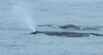 We went back into town to do the tourist bit and take the "recommended walks", stopping to say hi to Martin and Jeanette. All four of us went on the intrepid Christchurch walks and talked incessantly. At the end of the day we agreed that we would keep in touch, unfortuately we did not meet them again whilst in Christchurch, maybe somewhere else. We had also, at this stage heard from Peter and Carol (BMW R80RT that we met in Koh Chang, Thailand) who are also in New Zealand, so we are hoping to catch up with them again also. The evening before we left there was dinner and Ian and Pams inlcuding several of the Air New Zealand team that Jenny is in contact with. Next was Kiakoura, home of the whale watches and dolphin swimming. We pitched our tent and phoned to see what tours were available. Unfortunately, all the dolphin swimming was fully booked for the next day - we could go at 5.30 a.m. the following day (don't think so), so we just booked the Whale Watch tour. Amazingly we saw 7-8 sperm whales - huge things and we're afraid that none of the pictures really does it justice, we have one slightly blurred on that was rather lucky and it is below. |