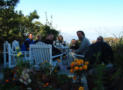 The ride to Katmandu was fairly easy and we even managed to find the guest house where Sean and Adrian were already staying, The priorite was to get the shipping of the bikes organised, so the next day we went to see the travel agent that many other overlanders have used and started to get the details sorted out, once the carpenter had been out to the hotel and measured the bikes up for the packing cases and our flights had been booked we were happy that we had done as much as possible, it was now a case of take the bikes to cargo at the airport on Monday morning and strip and pack them there. In Katmandu we had met up with one of Seans old school friends, a guy named Rupert, who lives in Chang Mai in Thailand but also has a place in Katmandu, Rupert proved to be a bad influence as we stayed up late and drank far to much, The sort of thing that we would never do !!!!. Rupert had organized for us all to ride the bikes out to Nargacot on Sunday and to meet up with a couple of ex-pat Americans and a guy who used to be the Czech ambassador (or something like that), unfortunately when we dropped by his house on the way he was unwell and so was not up to riding his Enfield up to Nargacot, so after having a beer with him we rode on up to Nargacot, following our American guide (Charles and .........................), We went to the fort hotel at Nargacot as this has the best view, on a clear day you can see Everest but we're not convinced that we could see it but you can see many mountain peaks from here, a nice place to relax but the hotel was empty. | ||||||||||||||||