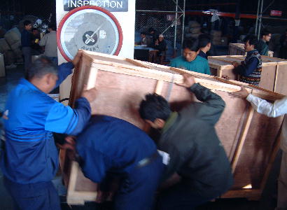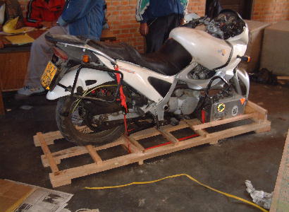On Monday morning we went to the airport to pack the bikes, whilst customs checked through all our stuff the carpenter arrived and laid out the bases for the packing cases Cliffs bike was the first to be put on the base and have the front wheel removed, having removed the front wheel Cliff and Adrian lifted the front of the bike up to move it on the base and in doing this Cliff put his back out, This was not good as we had only just started to pack the bikes, thankfully there was plenty of help available but it put the main work load on to Sean, Adrian and Jenny. | ||||||||||||||||