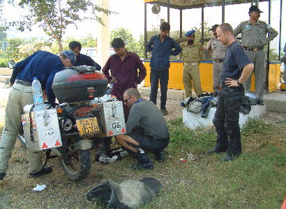 We had done about 100kms when we reached the new three lane highway, Maarten and Adrian went straight through the toll booth but Jenny and the rest of us had to stop as the man was standing in the road, he then told us that no motorcucles were allowed , after a couple of minites of this Bullshit I said to Jenny to put the bike in gear and go 30 seconds later she replyed that she was in gear but that the bloody thing won't go. Perfect timing, there we are all arguing with the toll booth man, telling him that it was no bloody wonder that Pakistan was a third world country and now we need to be nice to him and we will still not get onto there bloody motorway! . |