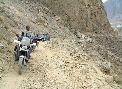 After tea and lunch we discussed the diversion, which we were told was about 7 kms and was a fairly easy jeep track, we set off to avoid the roadblock following our local guide. The first 2-3km were OK but then it started to deteriorate and now we had a sheer drop to our left side and a track 2-2.5m wide. After about 1km of difficult and at times dangerous track Jenny, who was trying a little too hard to keep away from the edge, failed to notice a lump of rock that was sticking out at an angle. She just caught the bottom corner of the right hand pannier on the rock and ripped off the pannier and in the process fell off the bike towards the edge. Although Jenny didn't really look like she was going to go over the edge, the bike went down very fast and dug into the soft ground, this was a little too close for comfort. We put the damaged pannier into one of the jeeps following along with the other one ( to even the weight ) and continued on, assuming that there would only be another 3km or so and it was over. About another 5 or 6km along the track we started to wind our way back down and at this point our guide stopped and we had a little discussion about the dangers and the length of this track. It turned out that we were now only at about the halfway stage. He showed us the hairpin track that we were to ride up in order to go further along and then down another hairpin track before we would come to a bridge and up to the road. | |||||||||||||||