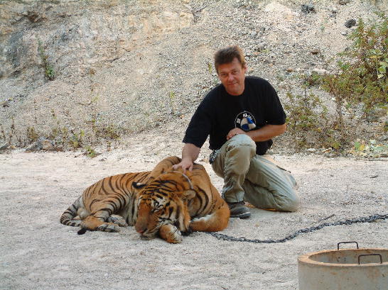 These Tigers are being looked after at a Monastery and as we understand the situation they have all come to the Monastery as Cubs as a result of the mother Tiger being killed by Poachers or some other reason, They also had one Leopard at the Monastery, When you arrive you are asked to make a donation rather than pay an entrance fee. We would never have found it if we had not already been told about the 'Tiger Temple' when we went into the tourist info office there was no info about the place but we asked, and were told how to find it. If anyone is interested, take the 323 out of Kanchanaburi towards the Burmese border, drive for about 35kms, when you see the 21 km milestone the Tiger Temple is up a dirt track on your right. |