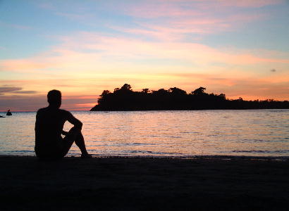 Chritmas morning and the world was bright and sunny (well it was in Koh Chang ) Pete, Carol, Sean and Kate joined the four of us on the veranda, after the opening of the pressies we chatted and drank coffee and reminiced about cold Christmas's back home, before heading for into town for lunch, and boy was it good, we had cheese, ham, salami eggs salad and black forest ham, Lovely. having enjoyed a good lunch it was back to base to get the bikes on to the beach for a photo, then it was into the sea for a swim before we watched the sun go down, | ||||||||||||||