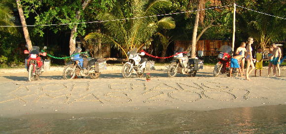 We were going to leave Koh Chang on the 27 th December, but after a difficult Boxing Day which involved laying on the beach, swimming and having a massage we decided that we needed the rest and chose to stay until the 28 th, Pete and Carol did leave on the 27 th and Ralf and Caroline were going to leave on the 27 th but after a late evening talking and drinking they failed find the enthusiam to get up and load the bikes, so they stayed for one more day. Having been in Thailand for less than two weeks we are really enjoying Thailand, It is so easy to understand why Ennio has been stuck here just travelling around for two years now. Finally on the 28 th we managed to get ourselves in gear and on aour way of the Island, It was time to head for Cambodia, After an easy days ride (Thailand has very good roads and pretty good driving-well after India anything is good) we got to the border town of Ayanya Prathet, where we found a hotel and some cheap beer. Tommorow Cambodia | ||||||||||||||