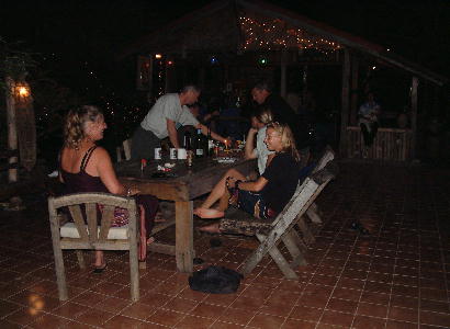 The two of us and Sean and Kate (we met Kate in Kathmandu and she decided to join Sean in Thailand once we new that Adrian had to return home for a while) found the Siam Bay Resort and we were welcomed by Pete and Carol and Ralf and Caroline. First things first, time for a beer and something to eat before the kitchen closed, then they told us that we did not have a Beach Hut free, or any of the bungalows either, but they had it all worked out, we were to have the double bed and share with Ralf and Caroline, and Sean and Kate would get the Veranda, however the single beds were quite big so Ralf and Caroline share one bed, Kate got the other single bed and Sean got the floor, fortunately the next day a small bungalow came free so Sean and Kate moved to that and we continued to share with Ralf and Caroline | ||||||||||||||